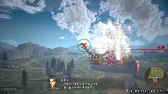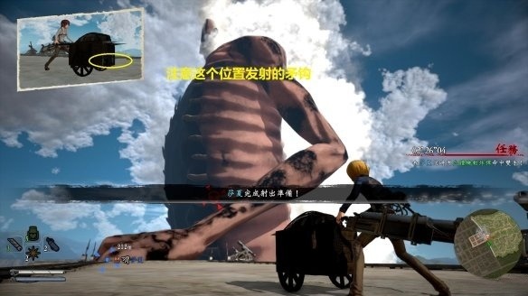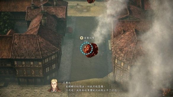 4、当然炮弹是无法阻止如此巨大的巨人,最终雷斯来到了城墙边。这时需要在规定时间内控制爱尔敏配合莎夏炸掉雷斯的双手。成功关键在于启动***的时机,注意左上角莎夏的动作,当看到她的炸药射出矛钩的瞬间我们也射出矛钩就能同时命中雷斯。