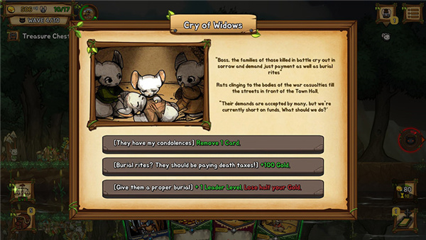 最后游戏中随着时间的推移会出现各种事件,这些事件都会标明选择带来的后果与收益,选择对自己有益的选项就行了。有的时候还会出现商人进行卡牌的售卖,有120秒的时间限制,超过后商人会离开。