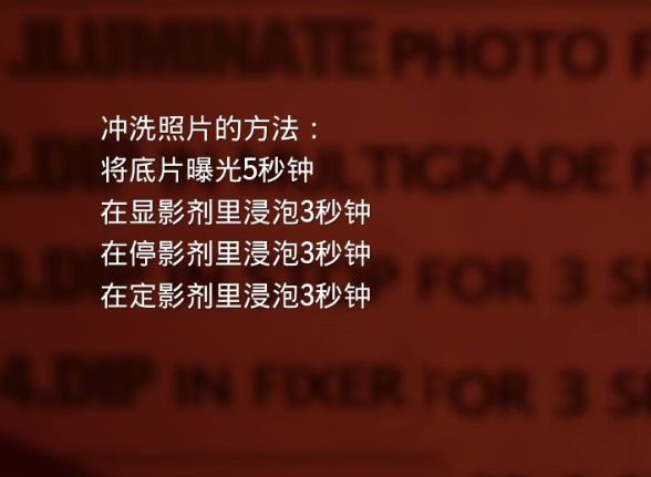 经过厨房来到暗室洗照片,墙上贴着洗照片的步骤: