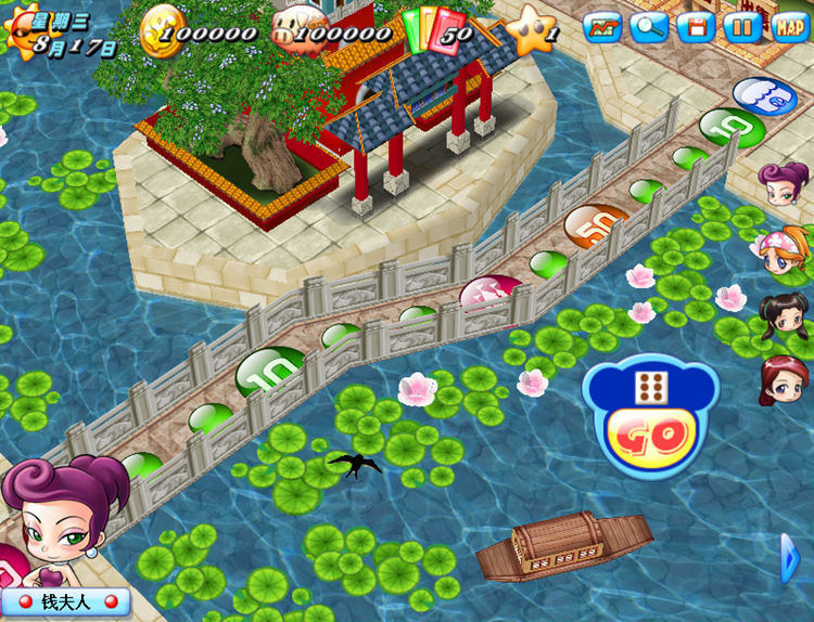 地图有三分之二在水上行走,白鹤振羽,青荷为路,还有仙灵桥、牌坊等标志性建筑。
