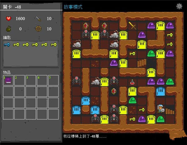 钥匙:不同颜色对应着不同颜色的门,开启一个门后对应的钥匙就会消失,缺少钥匙在碰到商人有机会可以购买