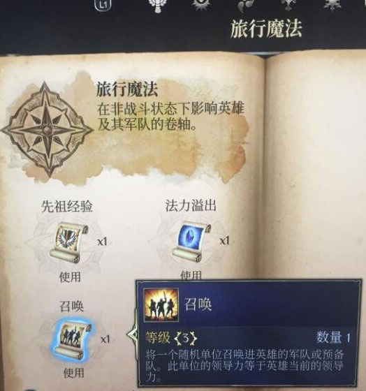 这是一个在路上见到的卷轴,在旅行魔法一览里面,顾名思义能召唤出最大和你统帅值一样的单位,具体记得在哪捡的,大家路上要仔细搜刮。