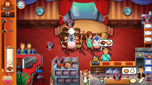 3、高手玩法:用情侣刷连续上菜分数,顾客只有一组的情况下使用情侣,可刷连击,注意盘子的存放数量,不要盘子只能放5种食物,你招待情侣和一组4人顾客,这样就没用了,情侣只有一人的时候,把放在和单人在一起,例如酒吧钢琴边的单人座位,单人顾客只会叫一种东西,然后再招待一组其他顾客,可以达到3击效果!