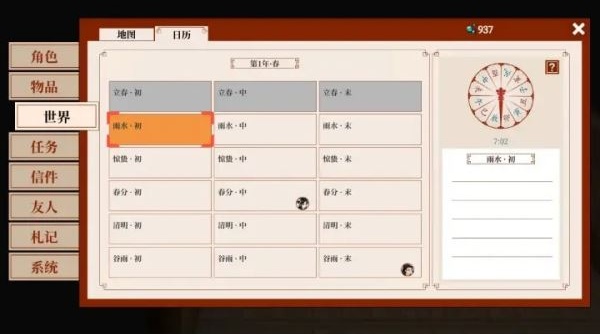 日历系统可以说是非常有国风特色了,做的是二十四节气,每个节气分成上中下三天。同样在日历中也会显示镇上居民亲友的生日,别忘了去送礼加好感度哦~