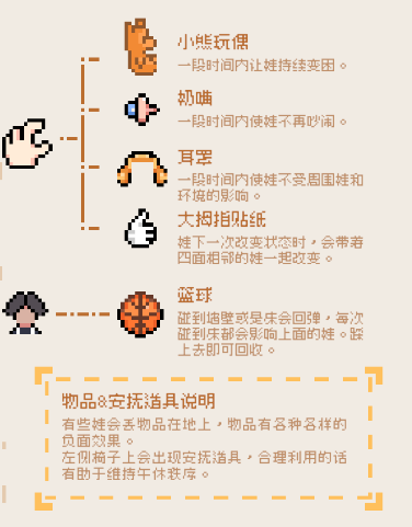 有些娃会丢物品在地上,物品有各种各样的负面效果 。左侧椅子上会出现安抚造具,合理利用的话有助于维持午休秩序。