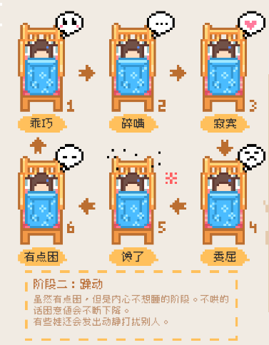 虽然有点困,但是内心不想睡的阶段。不哄的话困意值会不断下降。有些娃还会发出动静打扰别人。