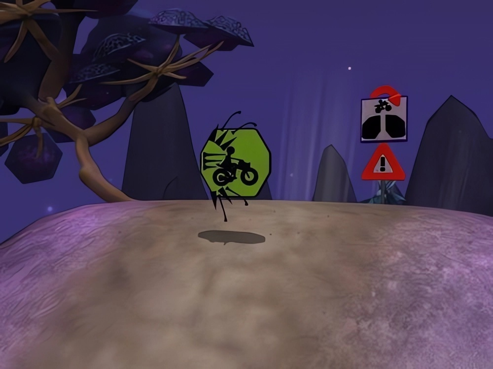 5、赛道也不是简单平坦的,车骑到一半可能碰上断崖,甚至是一座湖在赛道正中央挡着去路,这个时候就要及时做出反应,得马上启动喷射装置(空白键)让机车跳起,腾空跃过障碍。